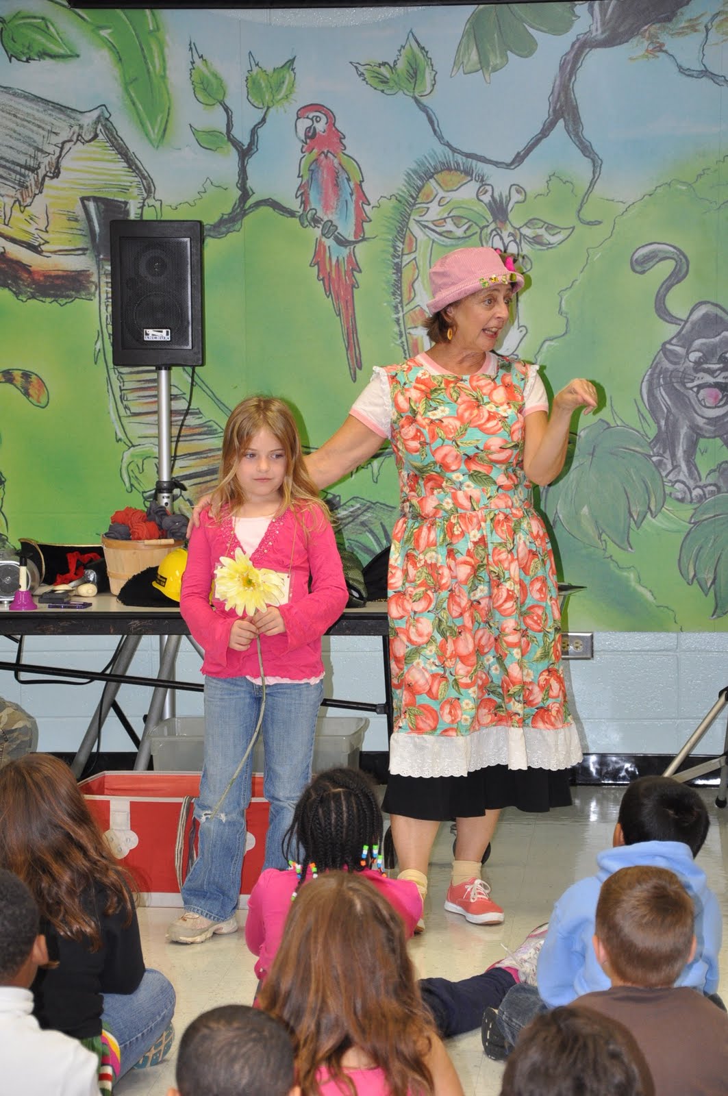 I got to be the hostess for one of the most fun presenters from Young Audiences. Cathy Kammerlain came to the elementary school this morning to present a show on Georgia history. The kids learned and laughed. Her show allows for a lot of audience participation. Here is a picture of Eve at the show: